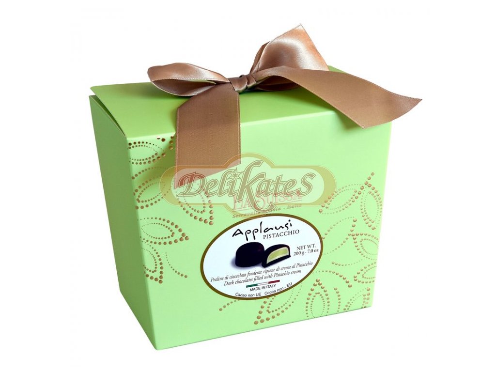 Zloženie: cukor, kakaová hmota, rastlinné tuky (palmový, palmojadrový), pistáciová pasta